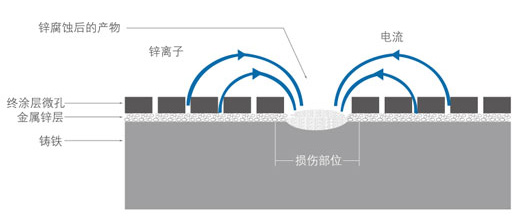 ● 損傷的自愈作用 噴鋅層的一個主要特點是能夠在損傷處自動修補保護層,以保護保護層的完整。鋅離子通過密封毛孔(即瀝青漆涂料)遷移到損傷處填補傷口并轉變成穩定的不可溶解的鋅化物。