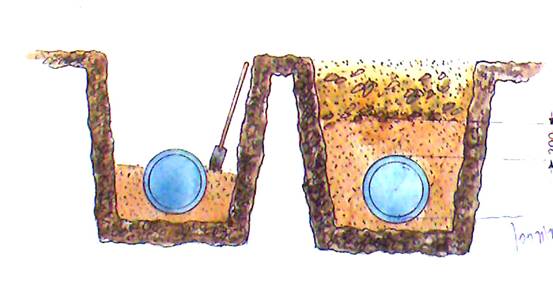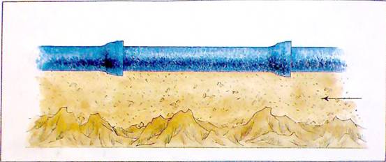 在多是石塊的土層情況下,為保護管子有條理地連續置放,應考慮安裝層的問題(松軟土質不必考慮)。安裝層由松軟的顆粒狀物質組成(沙土、小碎細石粒、過篩土),其厚度應保證底部距石塊層最小距離≮100㎜。見圖1