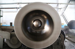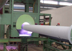 ●工藝簡要:將承口芯安裝到離心機上,球化合格的鐵水倒入定量包內,按照工藝規定要求,設定孕育劑加入量、管模粉加入量,計算機控制離心機的旋轉速度、行走速度及定量包的翻轉速度,鐵水隨著定量包的翻轉及離心機的行走澆注在旋轉的管模內,并凝固成管子,拔管鉗將管子從模內拔出。